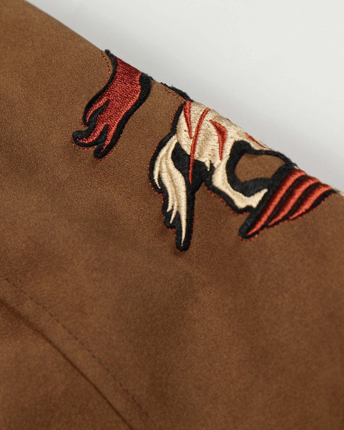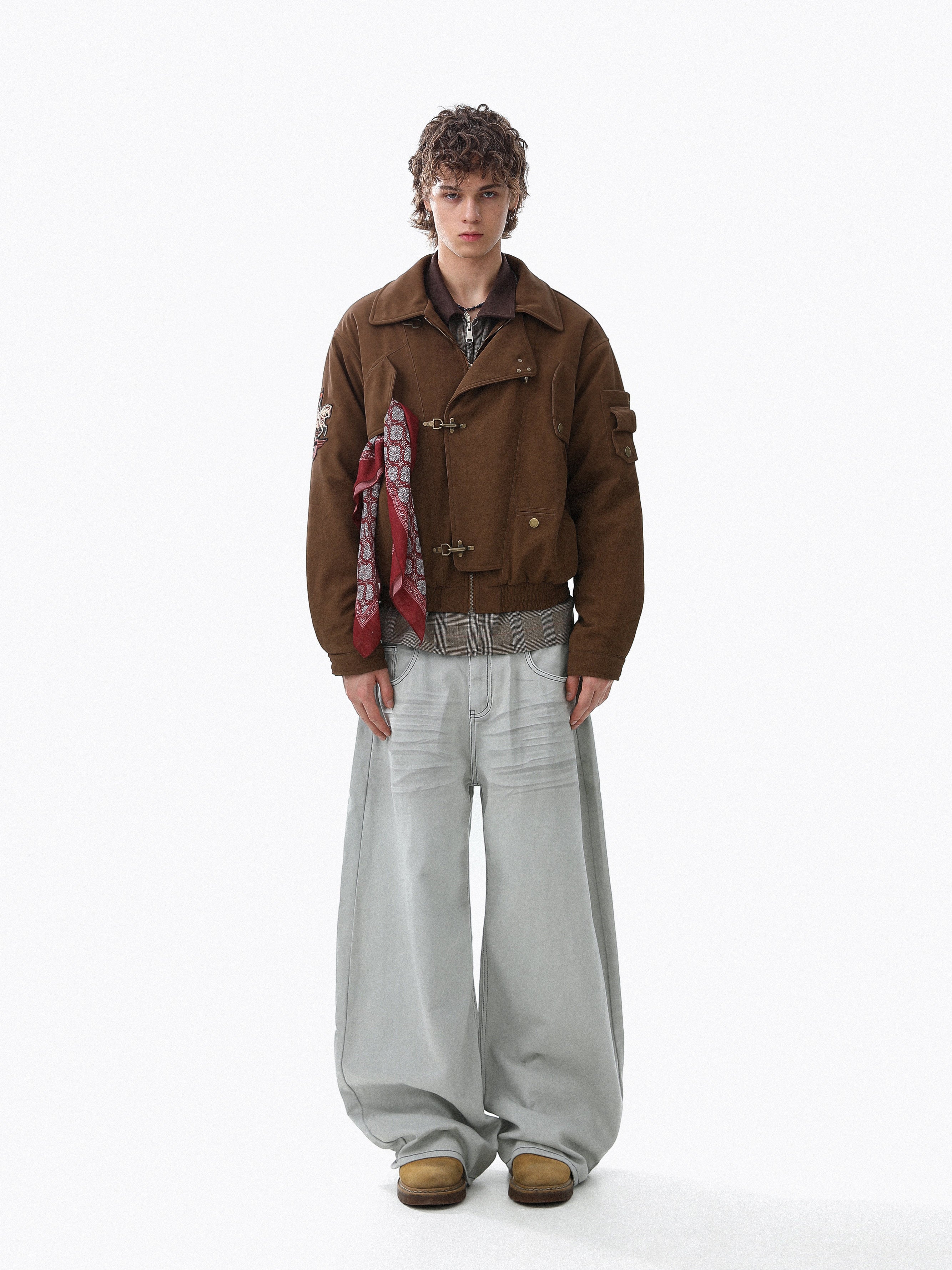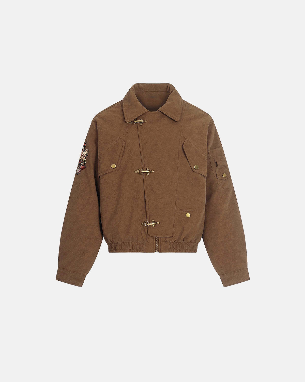 The INFLATION Horse Embroidered Suede Fireman Clasp Padded Jacket blends vintage workwear influence with modern streetwear attitude. Crafted from soft suede-touch fabric, this jacket features traditional fireman clasp closures, a cropped silhouette, and a bold Horse Year embroidered badge that adds symbolic, collectible appeal.