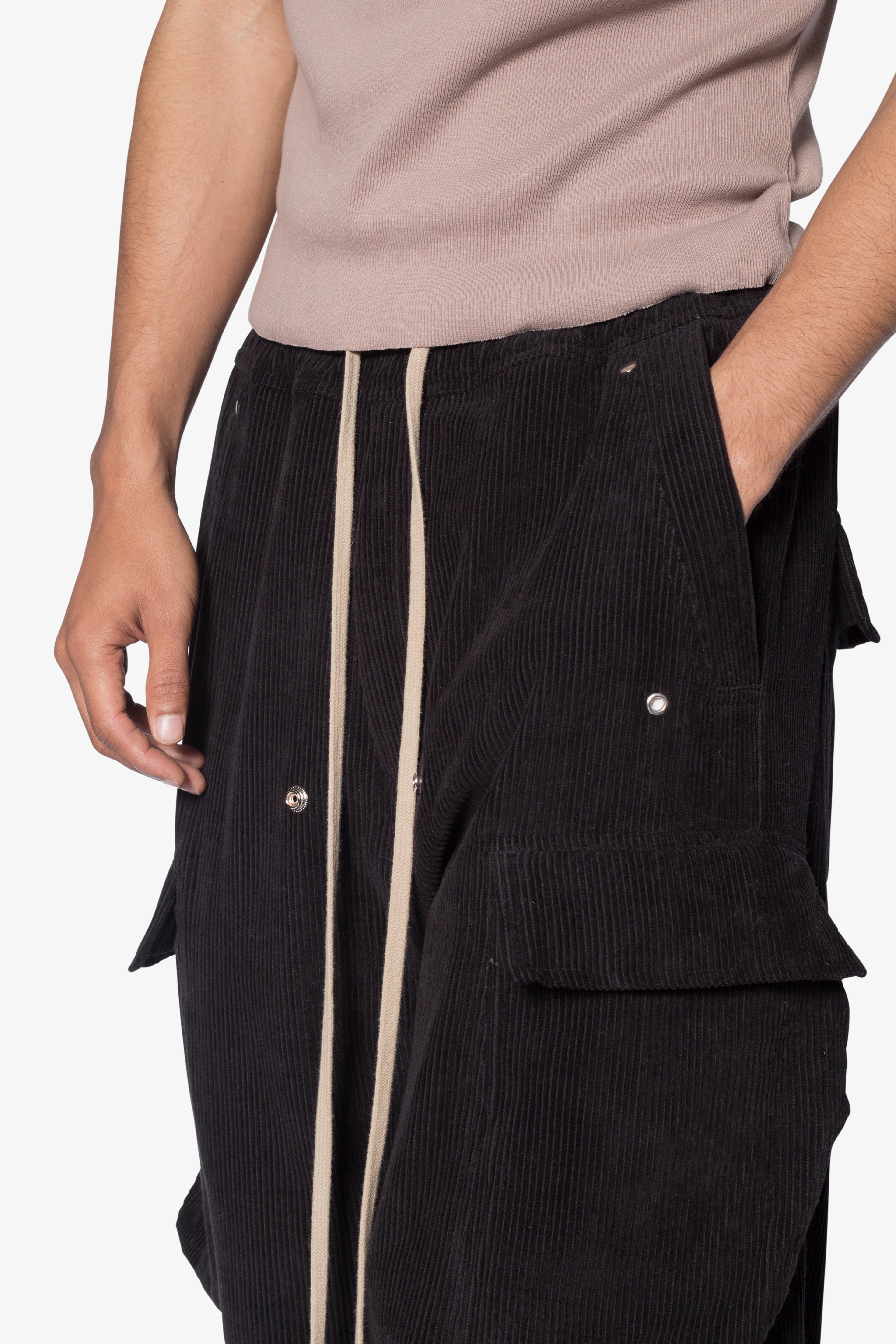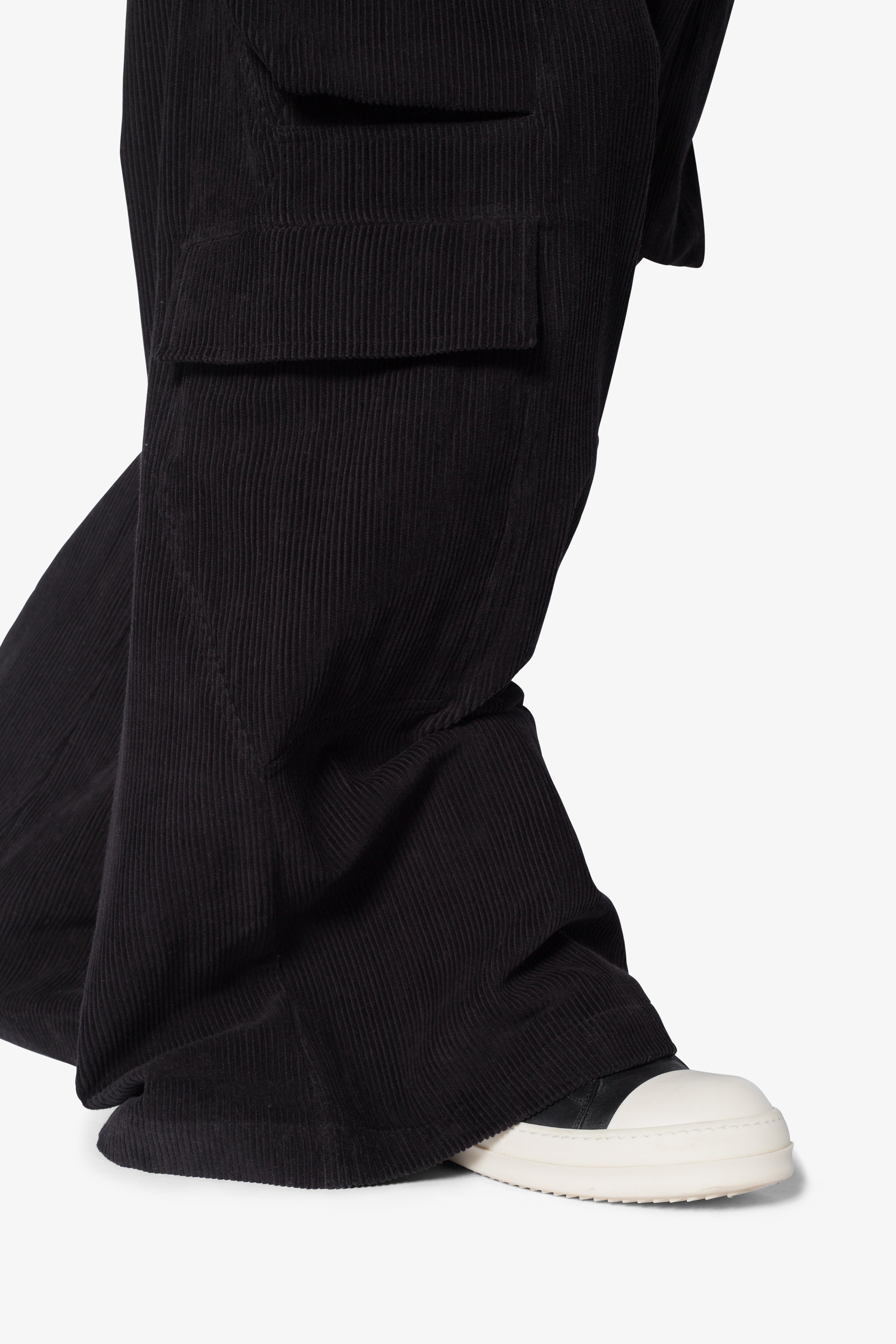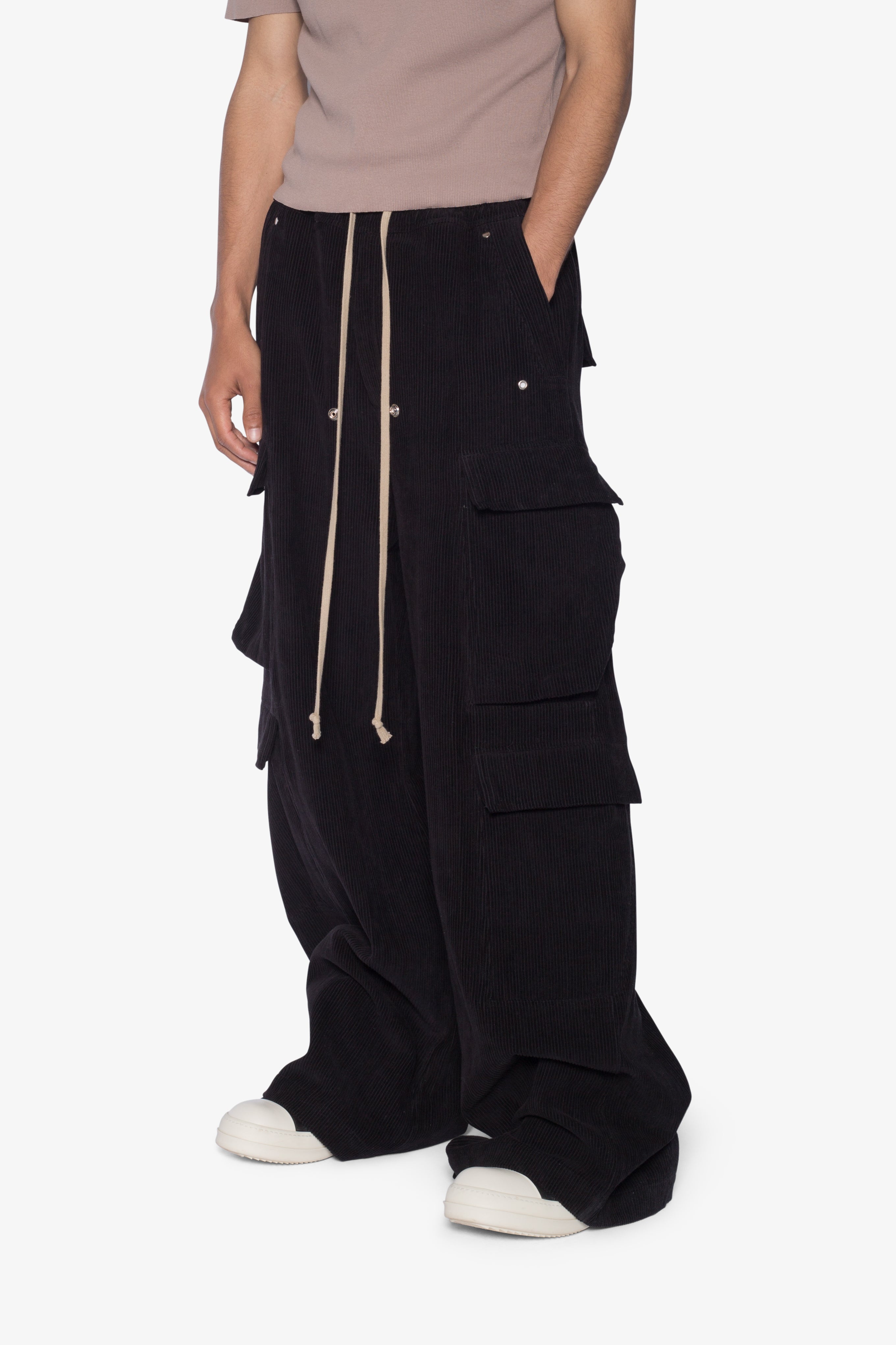 the Corduroy Rave Double Cargo Pants are designed with a new oversized rave fit, constructed from a cotton corduroy fabric, contrast drawcord, and finished with cargo pockets throughout.