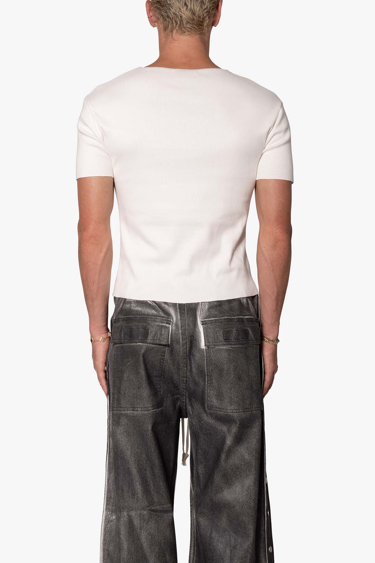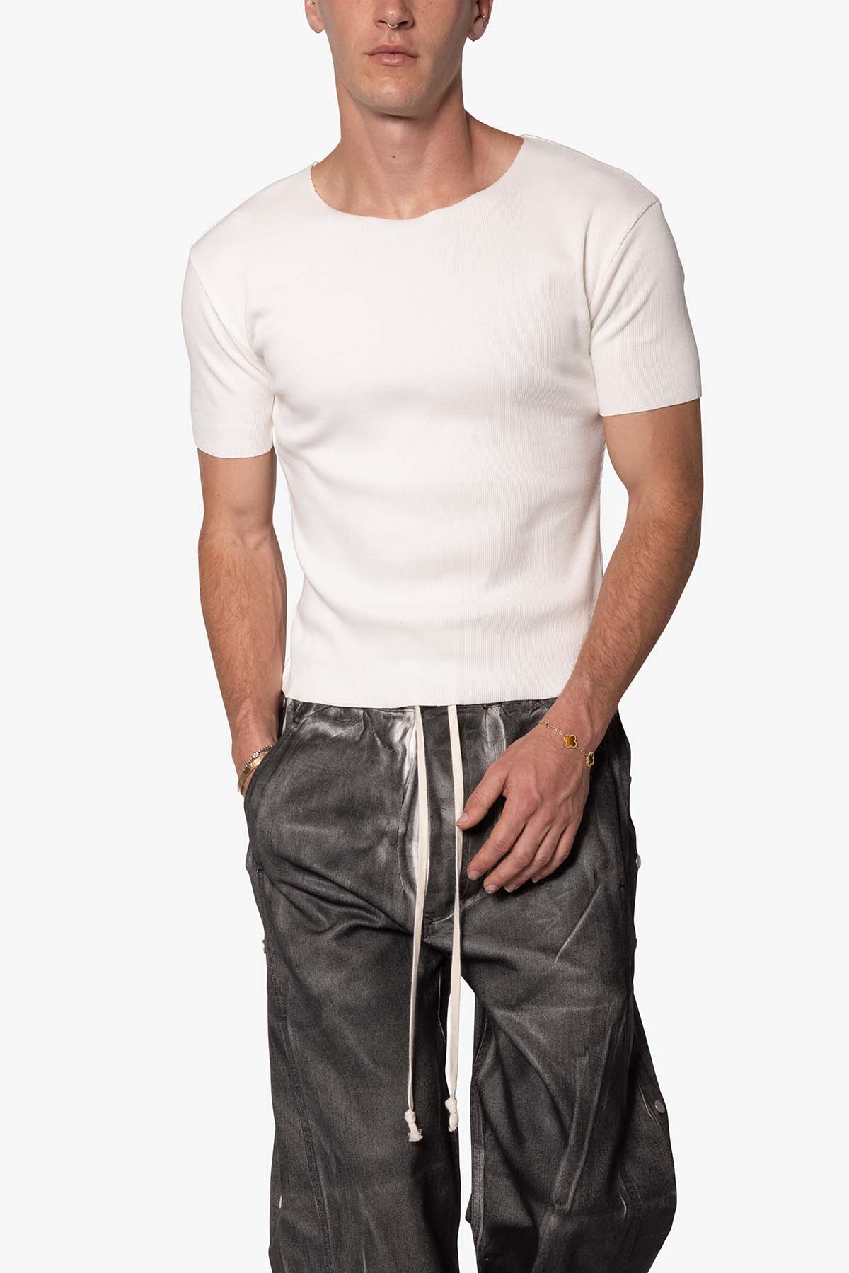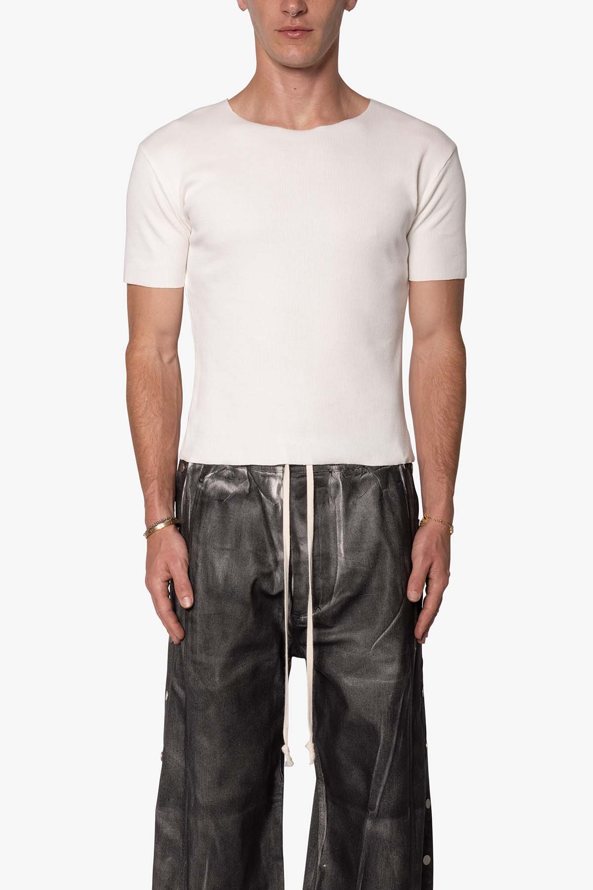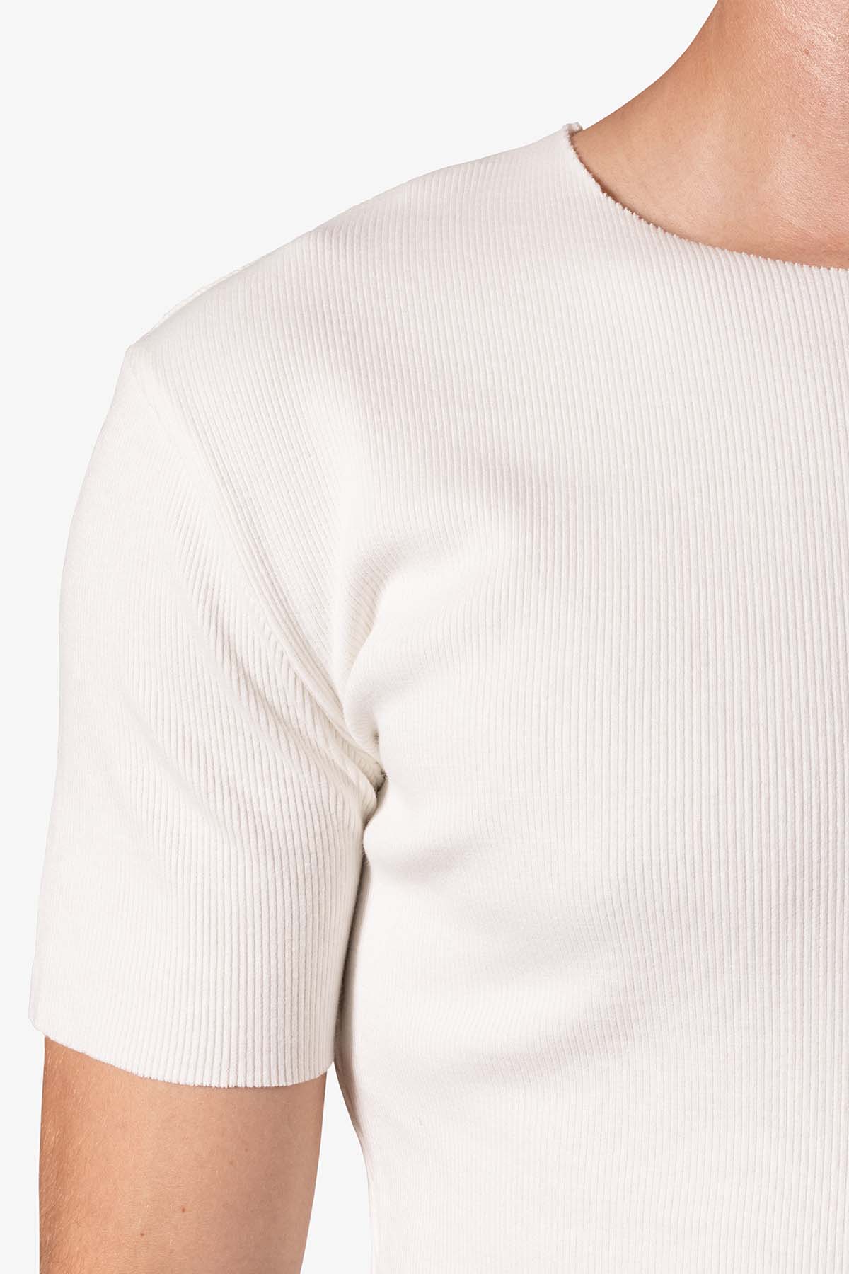 the Fitted Rib Tee is a 100% cotton tee is perfect as a base layer or worn alone. the tee features taping at the wide neck, a flat hem, and is constructed in a ribbed material